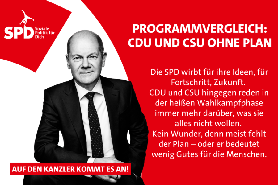 Ein kurzer vergleichender Überblick! Die SPD wirbt für ihre Ideen, für Fortschritt, Zukunft. CDU und CSU hingegen reden in der heißen Wahlkampfphase immer mehr darüber, was sie alles nicht wollen. Kein Wunder, denn meist fehlt der Plan – oder er…